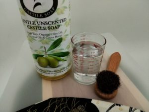 NOTE: Be very cautious if you have an awase kimono with a dark lining. I noticed in one area of my silk kimono, when I got it too wet, that the color of the lining was beginning to stain the kimono. Fortunately I caught it quickly, washed with castile soap and scrubbed gently with the brush and air dried it with a fan, which seemed to keep the lining from touching the kimono fabric.